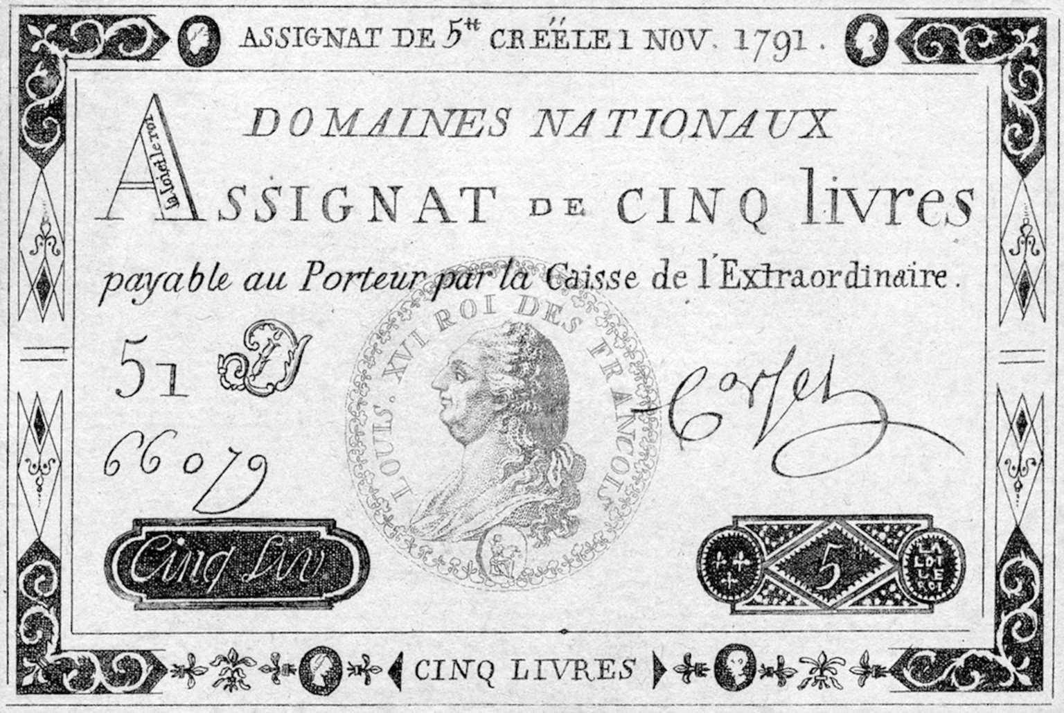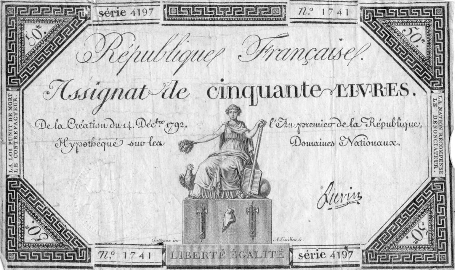 制宪议会为解决财政赤字问题,毅然决然地动用新型纸币,也就是指券。上图分别是当时的纸币面值:1791年5里弗尔(上)、1792年50里弗尔(下)。里弗尔是法兰西旧时的货币单位,直到1794年才被停用