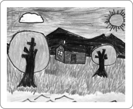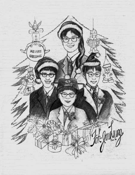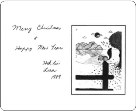 每年圣诞节,妈妈会在四个孩子一年的画作中选一幅比较有代表性的,缩小,复制,寄送给亲戚朋友们表达祝福。这是1996年的贺卡中,老四绘制的图画。