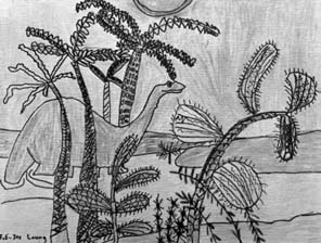 每年圣诞节,妈妈会在四个孩子一年的画作中选一幅比较有代表性的,缩小,复制,寄送给亲戚朋友们表达祝福。这是1996年的贺卡中,老四绘制的图画。
