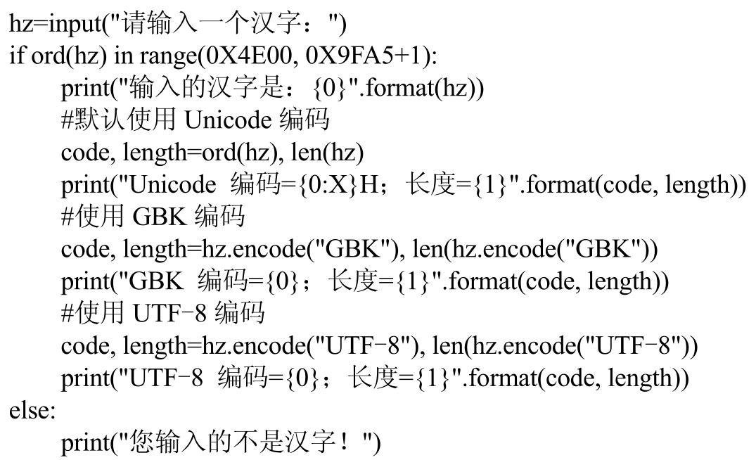 若要判断输入的字符是不是汉字,使用成员运算符in检查其Unicode编码是否位于汉字的编码范围内即可。在Python中,字符串默认使用Unicode编码方式。如果要获取字符串的其他编码(例如GBK、UTF-8等),可以通过调用字符串对象的encode()函数来实现,此时将以字节对象形式返回字符串的编码。字符串长度可以通过调用Python内置函数len()求出。