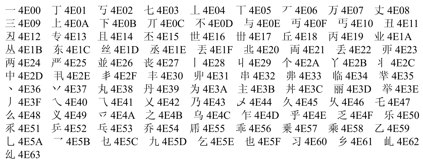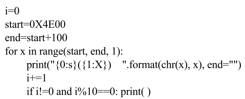【例3.2 】 按照Unicode编码从小到大输出前100个汉字及其Unicode编码。