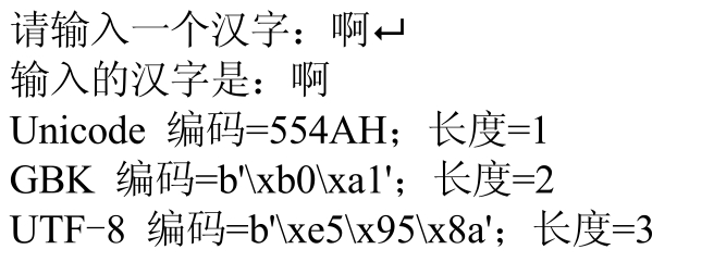 【例3.3 】 从键盘输入一个汉字,然后求出其Unicode、UTF-8和GBK编码,以及这个汉字以不同方式编码时的长度。