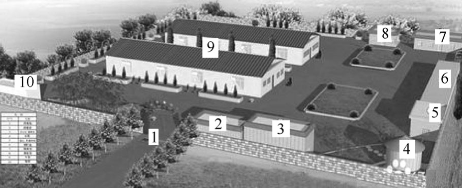 1—养驴场大门 2—接待室 3—办公室 4—化粪池5—细饲料棚 6—粗饲料库 7—工人宿舍8—药物室 9—驴舍生活区 10—隔离区