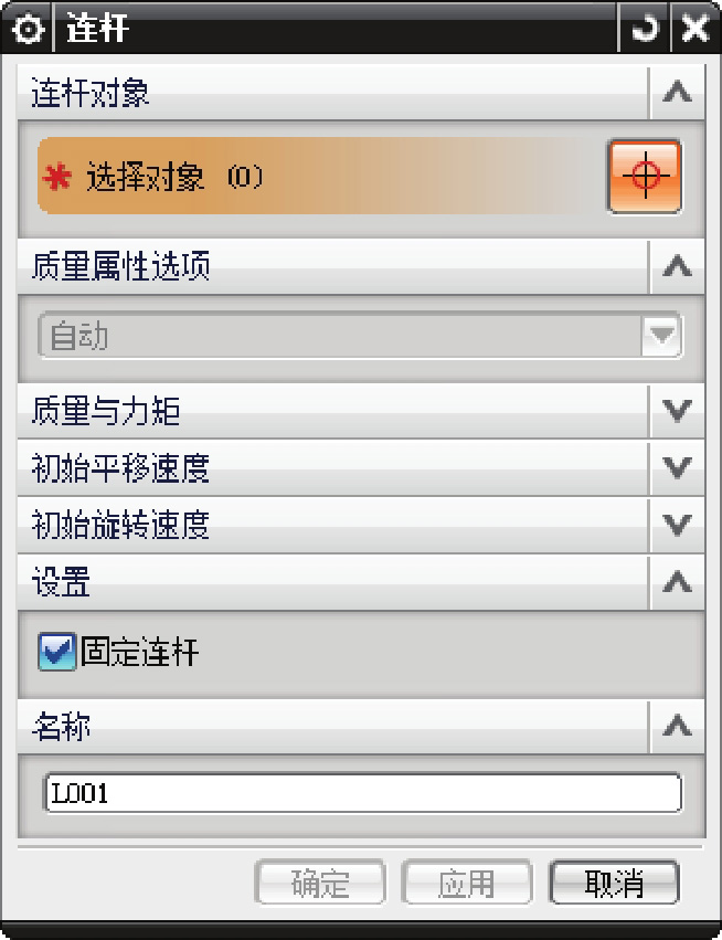 定义连杆需要先指定一个几何体对象,然后自动或者手动定义其质量属性,再根据机构运动条件判断是否需要定义初速度,最后确定该连杆在机构运动时是否固定。如果固定,则需要选中“连杆”对话框中的