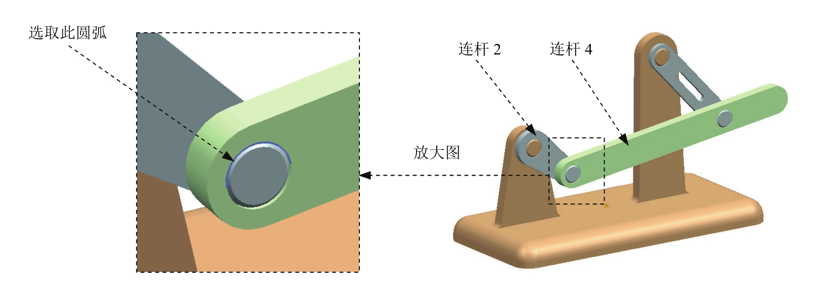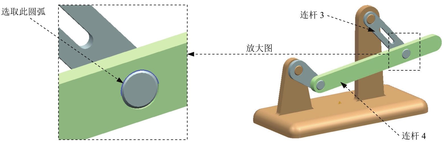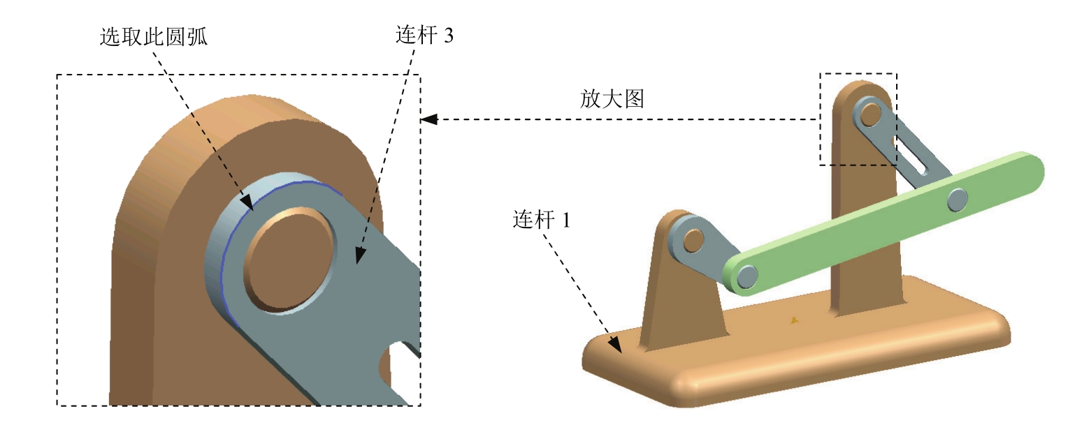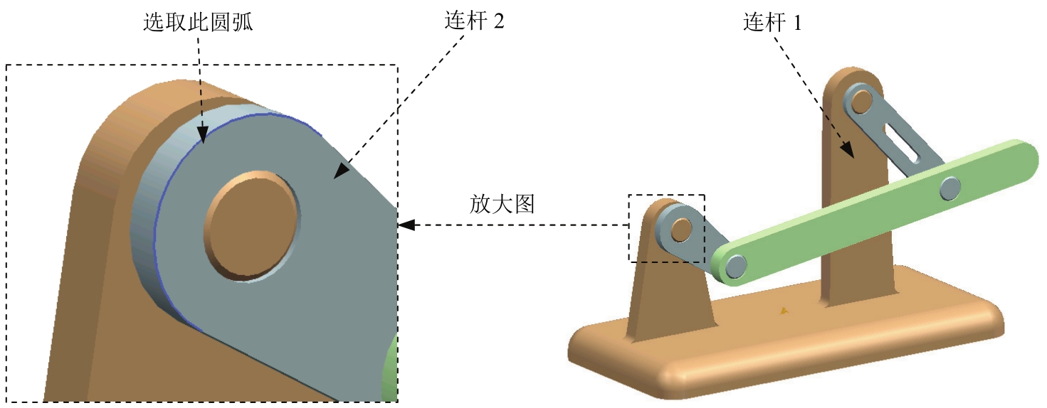 在选择参考连杆时,系统会自动默认鼠标单击的位置为旋转轴原点,鼠标单击的位置和对象不同,原点的位置也不同。如果在选择连杆时由于单击连杆的任意位置而导致原点的位置错误,必须在“运动副”对话框的