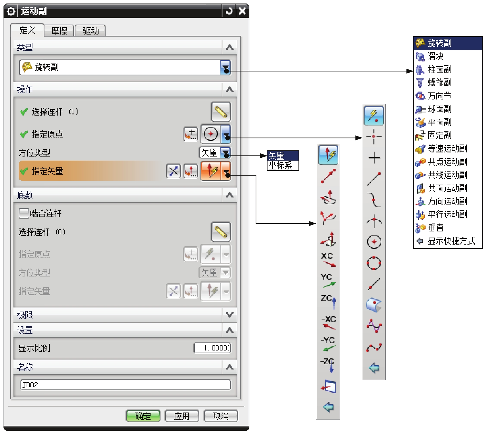 运动副是指机构中两连杆之间组成的可动连接,添加运动副的目的是为了约束连杆之间的位置,限制连杆之间的相对运动并定义连杆之间的运动方式。在UG NX运动仿真中,系统提供了多种运动副可供使用,以满足连杆之间的相对运动要求,如“旋转副”可以实现连杆之间的相对旋转,“滑动副”可以实现连杆之间的直线平移。