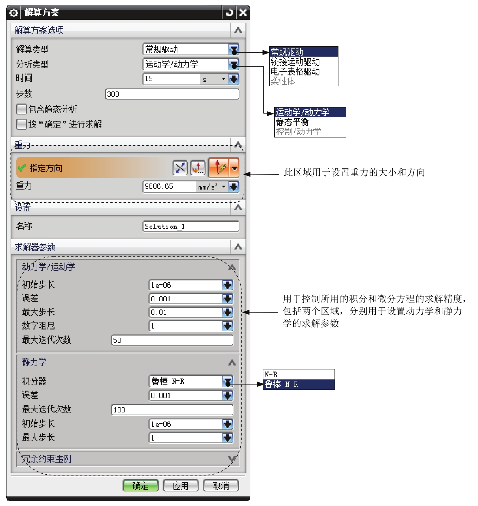 定义解算方案就是设置机构的分析条件,包括定义解算方案类型、分析类型、时间、步数、重力参数以及求解参数等。在一个机构中,可以定义多种解算方案,不同的解算方案可以定义不同的分析条件。