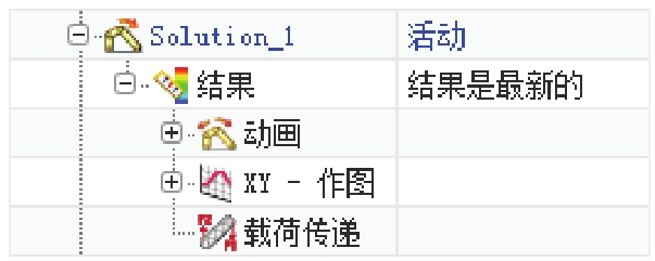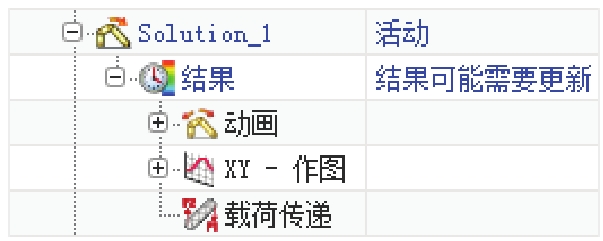 命令(或者双击“Solution_1”节点),可以在系统弹出的“解算方案”对话框中编辑当前的解算方案。一旦对解算方案进行了修改,则需要对该方案进行重新求解,才能得到最新的分析结果。系统会对未求解的解算方案在“结果”节点下提示“结果可能需要更新”,如图2.7.4所示。求解后更新的“结果”节点如图2.7.5所示。