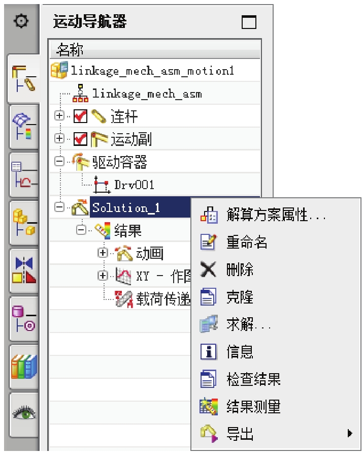 ● 解算方案定义并求解完成后,“运动导航器”界面(一)如图 2.7.2 所示,在“Solution_1”节点下显示当前活动的解算方案,右击“Solution_1”节点,在图2.7.2所示的快捷菜单中还可以对解算方案进行删除、重命名和查看信息等操作。