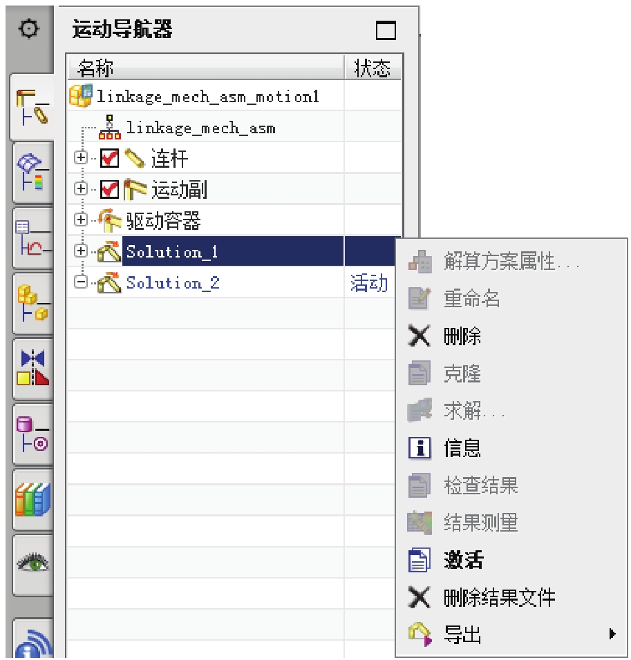 ● 如果当前机构中有多组解算方案,则需要先激活一组解算方案,才能对该方案进行编辑和求解。激活的方法是双击该解算方案节点或者是右击方案节点“Solution_1”,然后在系统弹出的快捷菜单中选择“激活”命令。激活后的解算方案节点右侧会显示“活动”字符提示,如图2.7.3所示。