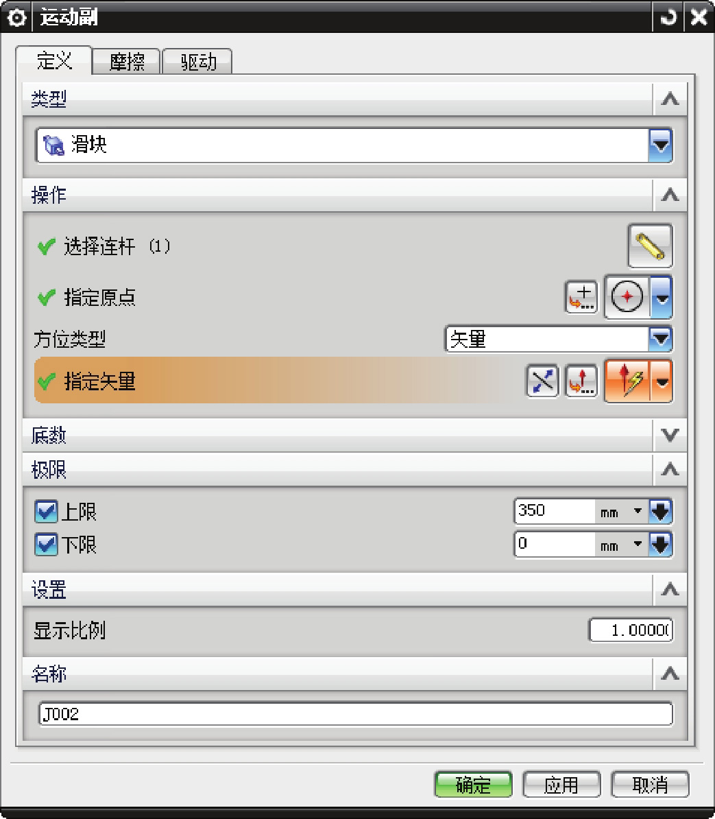 滑动副定义的连杆可以沿着直线相对于啮合连杆进行移动,但不能旋转。滑动副提供了一个平移自由度,没有旋转自由度。滑动副又可分为两种形式:一种是两个连杆沿直线做相对转动,此时需要定义主要连杆和啮合连杆;另一种则是以固定连杆为参考进行平移。滑动副还可以作为机构中的驱动,提供沿直线运动的动力。