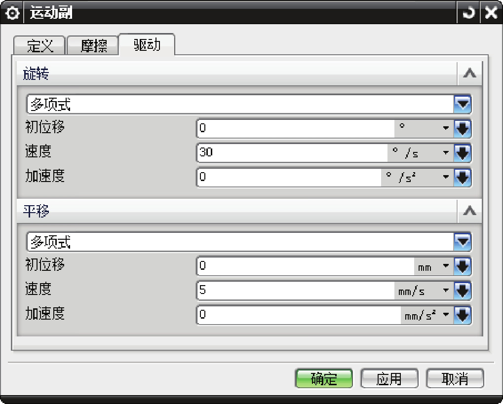 柱面副连接的连杆既可以绕轴线相对于附着元件转动,也可以沿轴线平移,柱面副提供一个旋转自由度和一个平移自由度。柱面副可以作为运动驱动,但是柱面副不能定义运动的极限范围,如果需要定义运动极限范围,可以将柱面副用一个旋转副和一个滑动副替代。