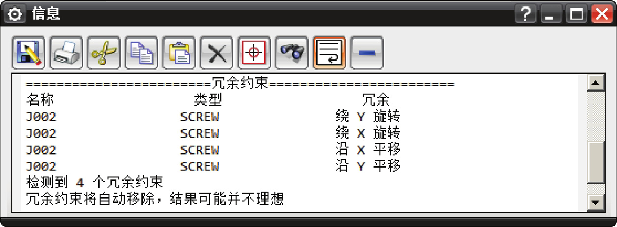 说明: 在本例中解算方案解算完成后,系统可能会弹出图4.5.6所示的“信息”提示框,提示当前机构中的约束有冗余约束,这是由于当前默认使用的是“RecurDyn”求解器,在该求解器的解算中,螺旋副已被默认为一种特殊的柱面副,如果继续添加柱面副,则系统会判定柱面副是冗余的,并自动将多余的约束删除。