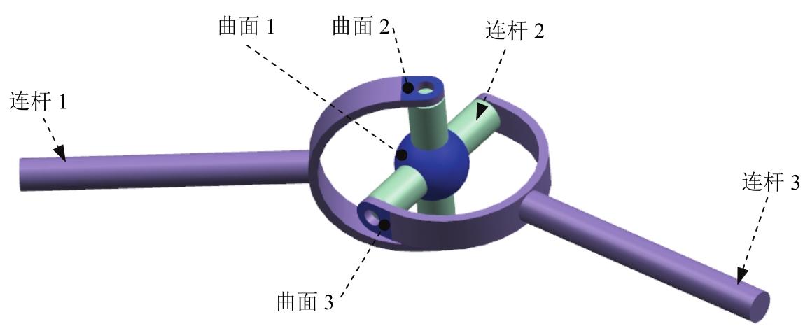 Step5.参照Step4的操作步骤,定义连杆2和连杆3中的旋转副。选取图4.6.4所示的连杆2为参考连杆;选取图4.6.4所示的连杆3为啮合连杆;选取图4.6.4所示的球面(曲面1)为原点参考;选取图4.6.4所示的曲面3为矢量参考。
