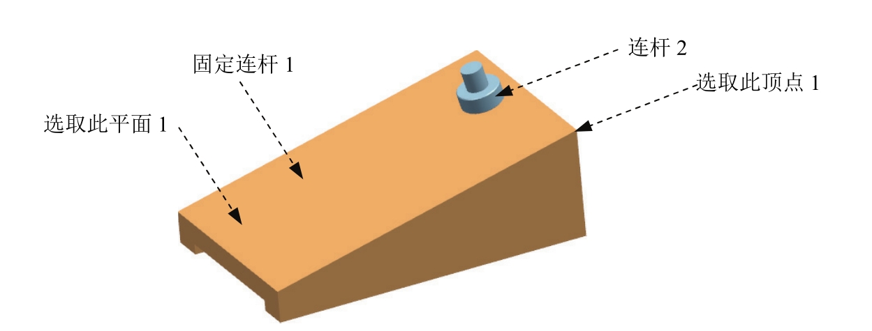 下面举例说明平面副的创建过程,在图4.8.1所示的机构模型中,已经创建了一组仿真文件并定义了固定连杆1和连杆2,本例模拟的是滑块(连杆2)在斜面上由于重力的作用向下滑动的过程。