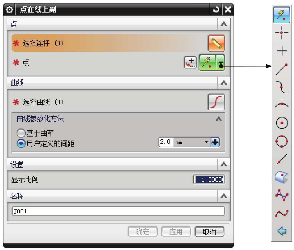 点在线上副可以使连杆中的一点始终在一条曲线上运动。点可以是基准点或元件中的顶点,曲线可以是草绘的平面曲线或3D曲线。由于机构在运动时不会考虑连杆之间的干涉,在创建连接时要注意点和曲线的相对位置。另外,为了获得较好的仿真效果,在装配机构模型时最好将参考点预先约束在参考曲线之上。