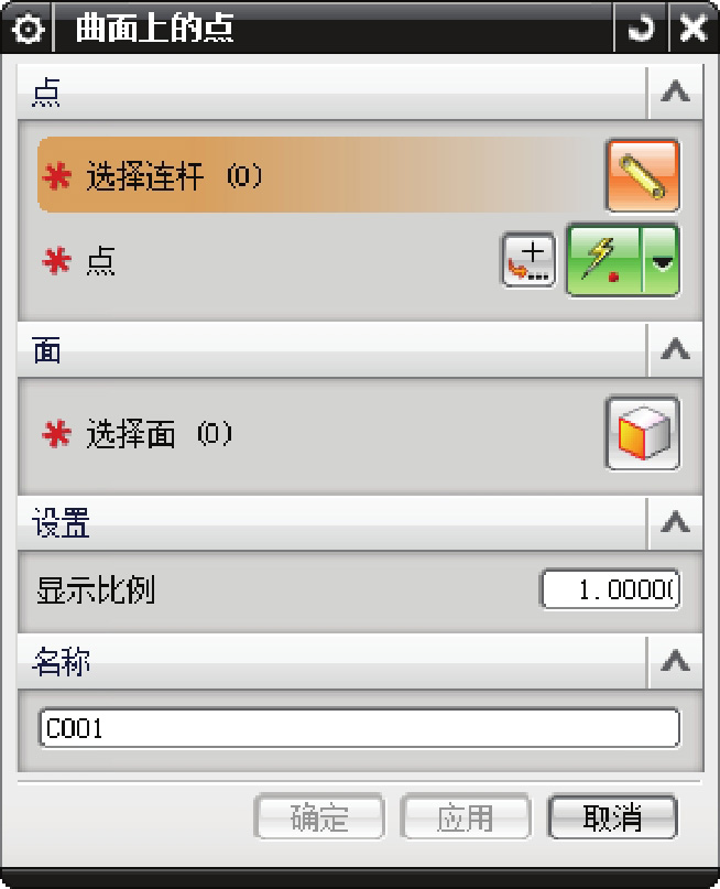 点在面上副可以约束连杆中的某点在一个曲面之上,在机构运动过程中,参考点和参考曲面必须始终保持接触,在装配机构模型时,最好预先将参考点调整到与参考曲面接触的位置。点在面上副可以用于模拟汽车刮水器的工作过程。