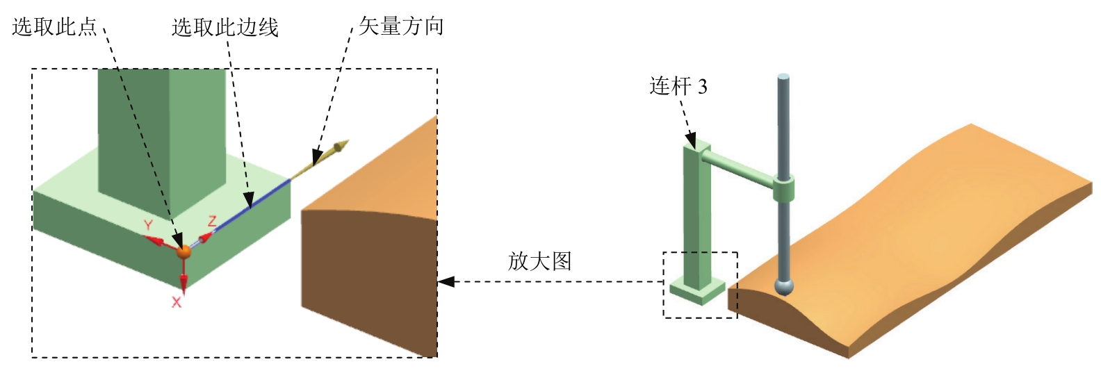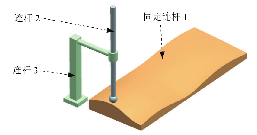下面举例说明点在面上副的创建过程,在图 4.11.1 所示的机构模型中,已经创建了一组仿真文件并定义了固定连杆1和其他连杆,本例模拟的是探针(连杆2)在曲面上滑动的过程。