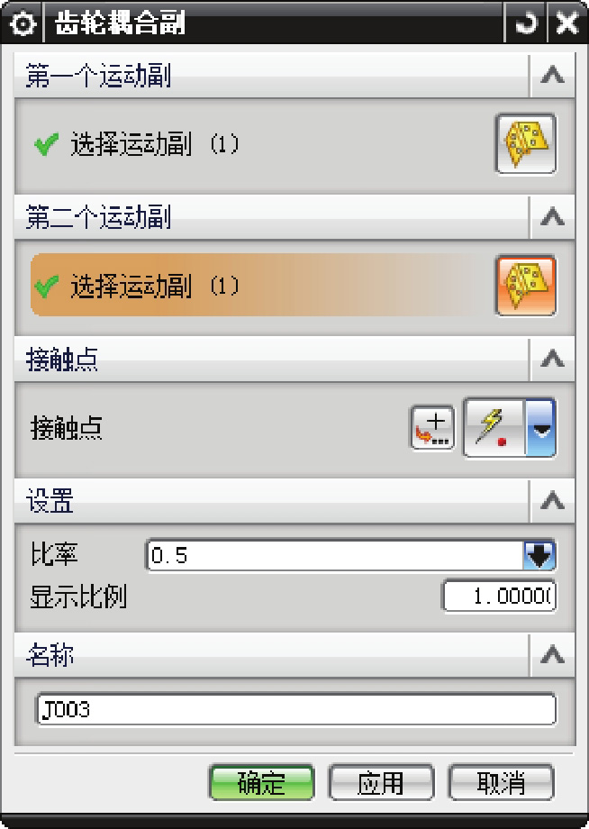 按钮,选取旋转副J002为齿轮的第二个运动副。