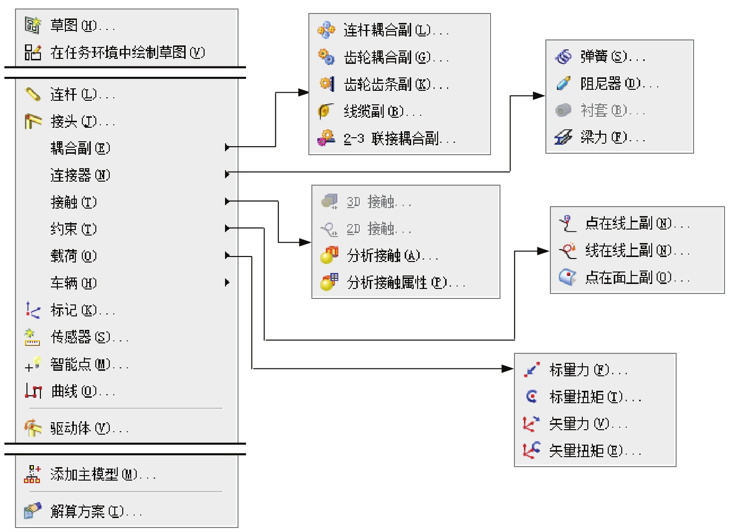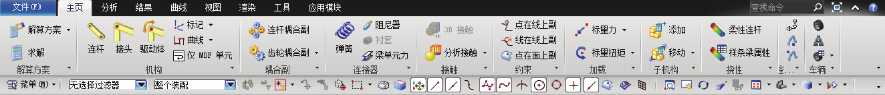 在运动仿真模块中,与“机构”相关的操作命令主要位于