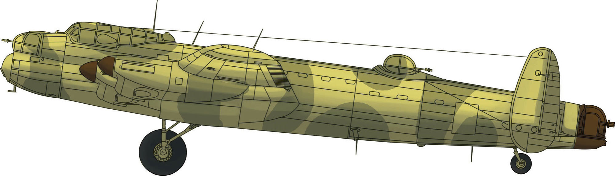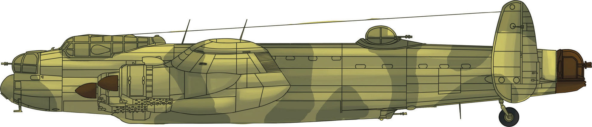 “兰开斯特”重型轰炸机的机身非常坚固。机头、机尾和后机身上部安装有自卫机枪。双垂直尾翼安装在较低的水平尾翼两端。