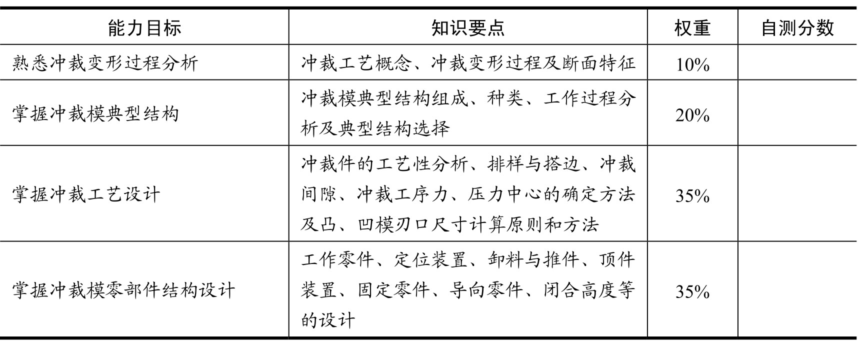 理解冲裁变形过程分析,掌握冲裁件工艺性分析、排样与搭边、冲裁间隙、冲裁工序力、压力中心的确定方法及凸、凹模刃口尺寸计算原则和方法,掌握冲裁模的典型结构、组成、工作过程分析和零部件的结构设计。