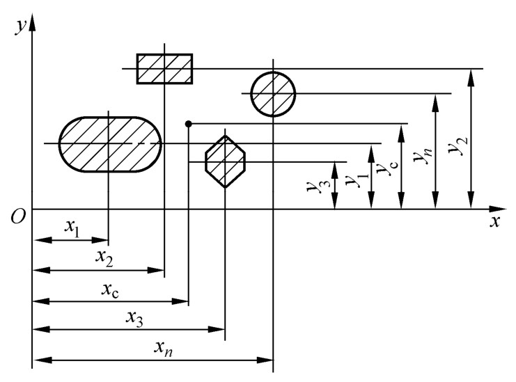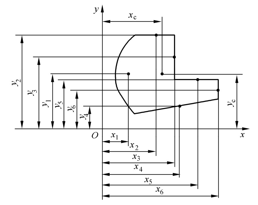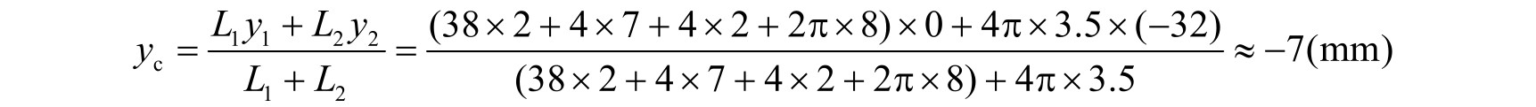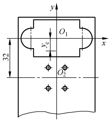 如图2.70所示,因为工件图形对称,所以落料时的压力中心在 O 1 上,冲孔时的压力中心在 O 2 上,总的压力中心在 y 轴上,由式(2-25)得