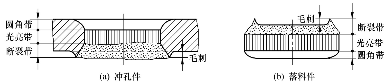 冲裁件的断面具有明显的区域性特征,在断面上明显地分为圆角带、光亮带、断裂带和毛刺四个部分。如图2.4所示为冲孔件和落料件断面的四个区域。