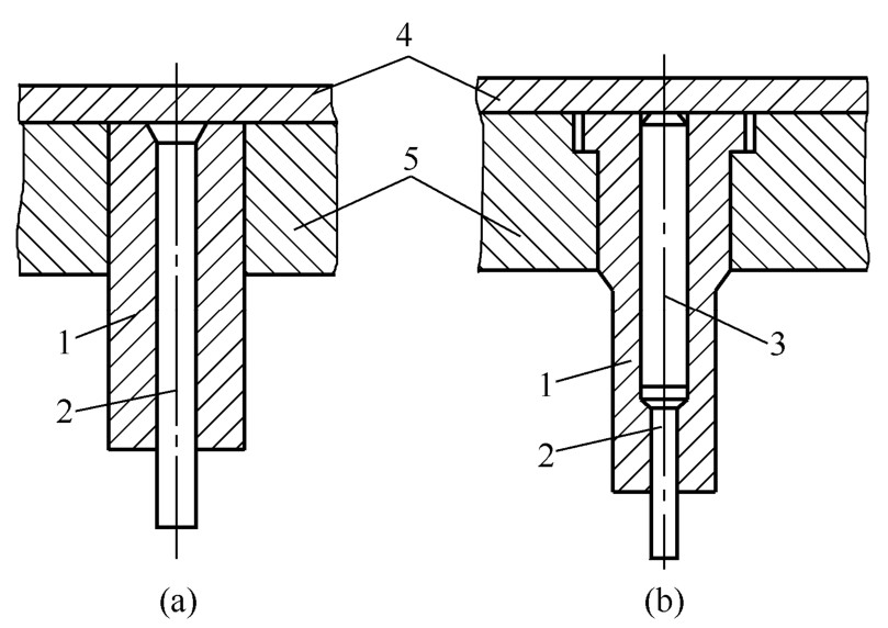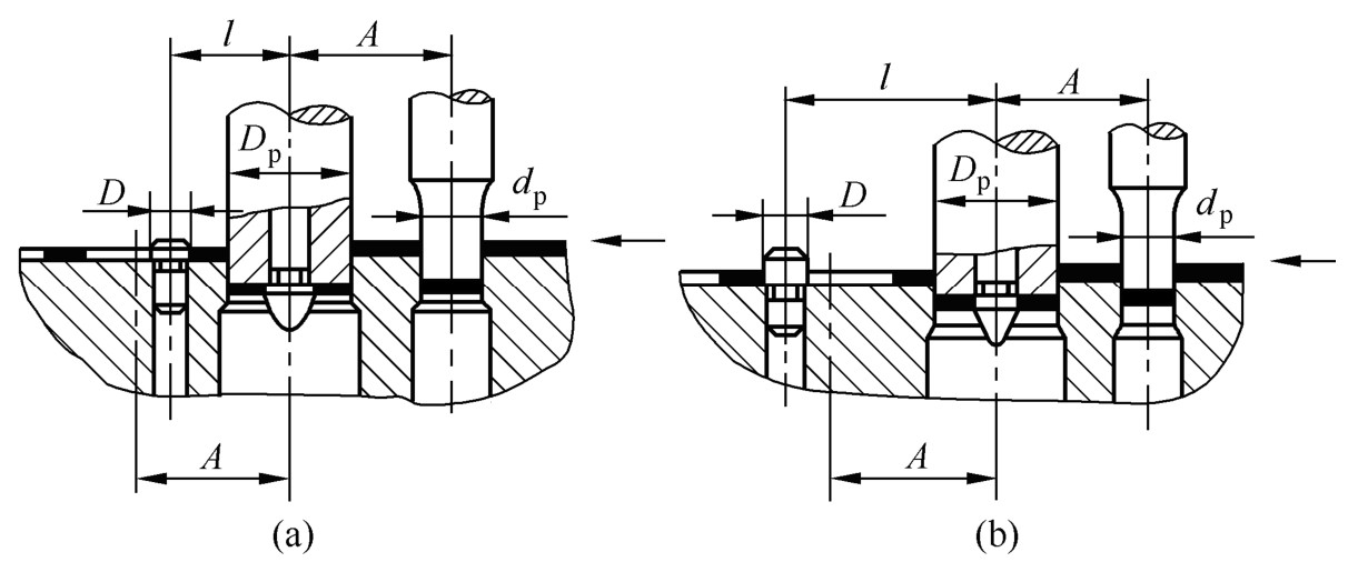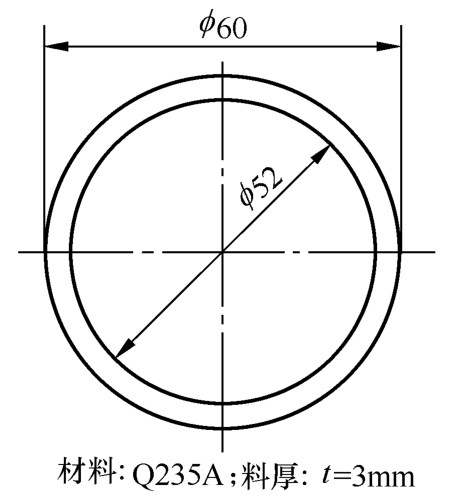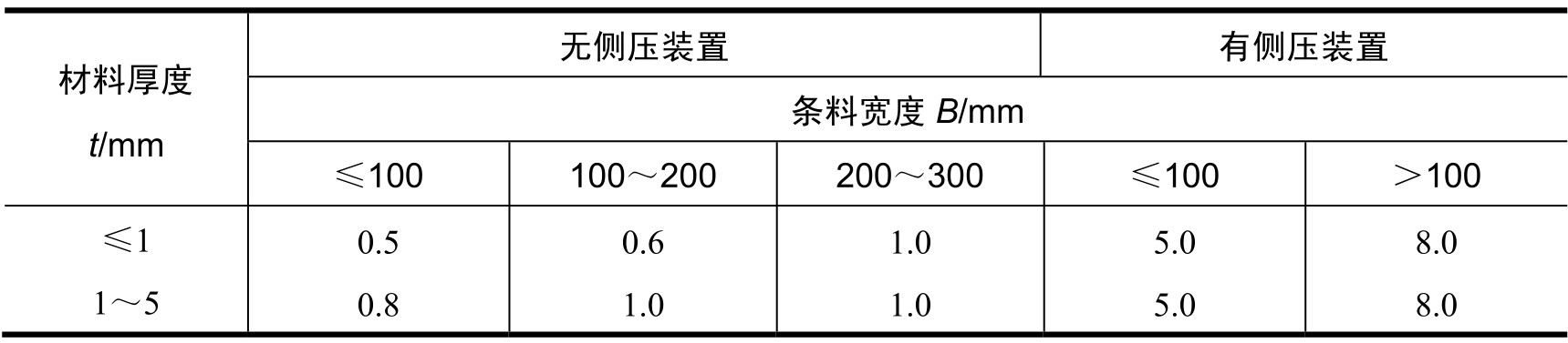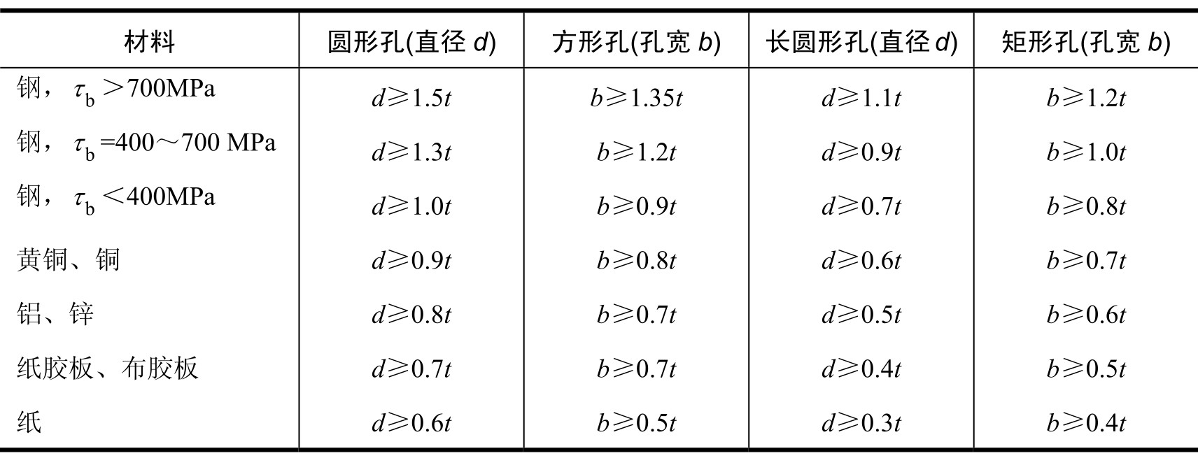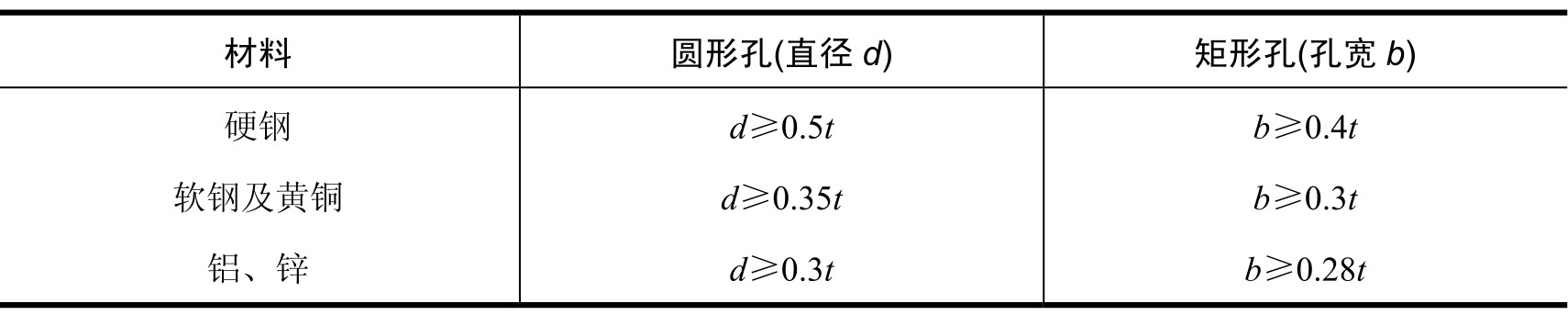 (4)冲孔时,孔径不能太小,以防止凸模折断或弯曲。可冲压的最小的孔径有两种情况:表2-2所示为无导向凸模冲孔的最小孔径;表2-3所示为带保护套凸模冲孔的最小孔径。