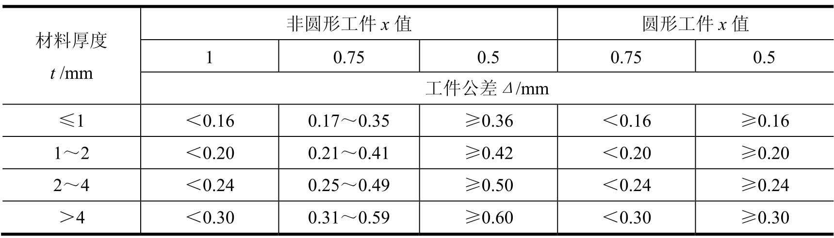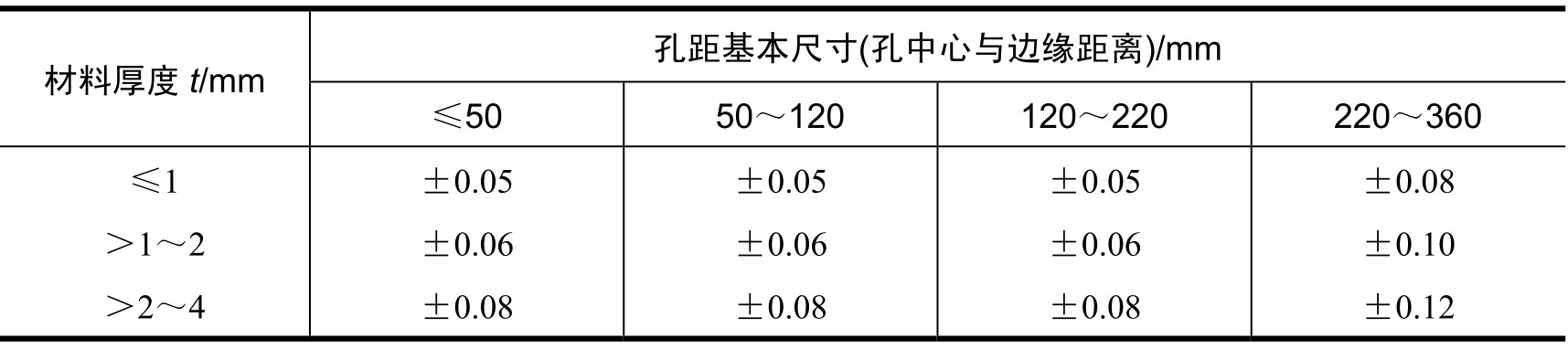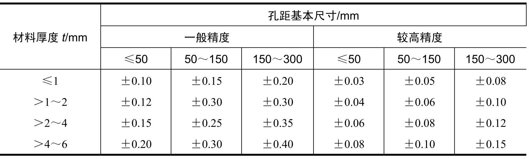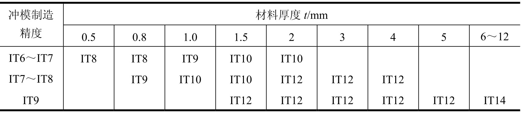 (1)尺寸精度。金属冲裁件的经济精度不高于IT11级。对于经济精度要求高的制件,外形尺寸应低于IT10级;内形尺寸应低于IT9级。内形尺寸精度取决于凸模刃口尺寸,制造容易一些,尺寸精度可比外形尺寸的精度高一级。冲裁件的尺寸公差、孔中心距的公差及孔对外缘轮廓的偏移公差分别见表2-4、表2-5、表2-6。