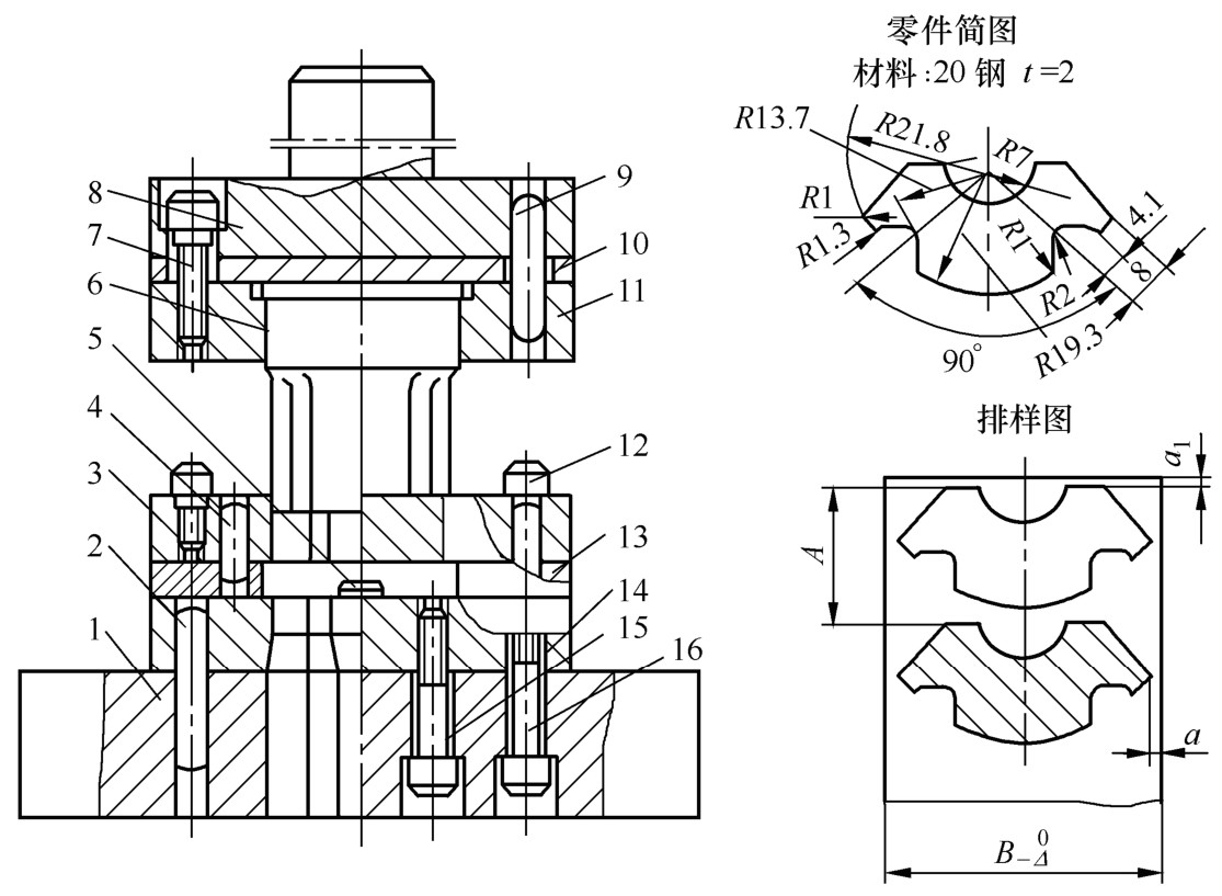 1—下模座;2,4,9—销;3—导板;5—挡料销;6—凸模;7,12,15,16—螺钉;8—上模座;10—垫板;11—凸模固定板;13—导料板;14—凹模