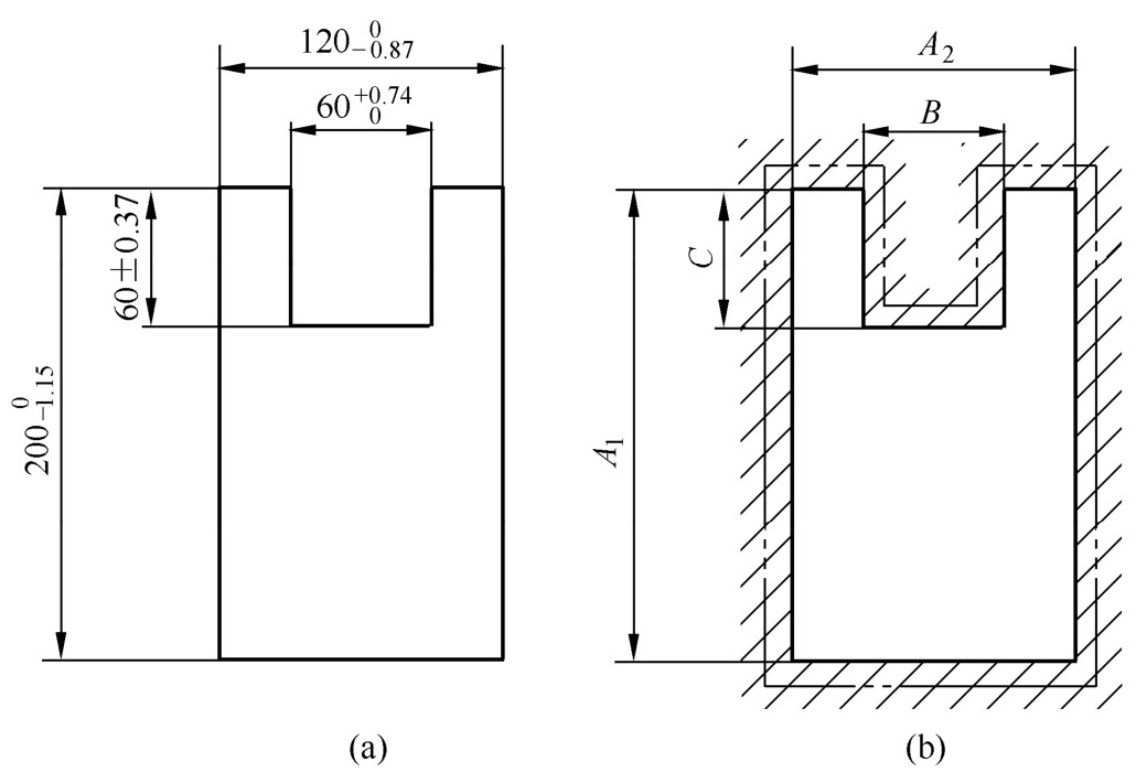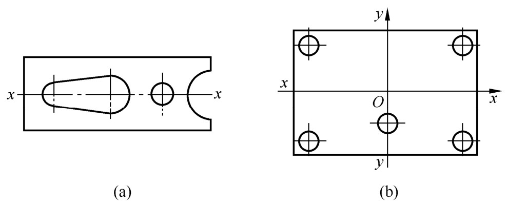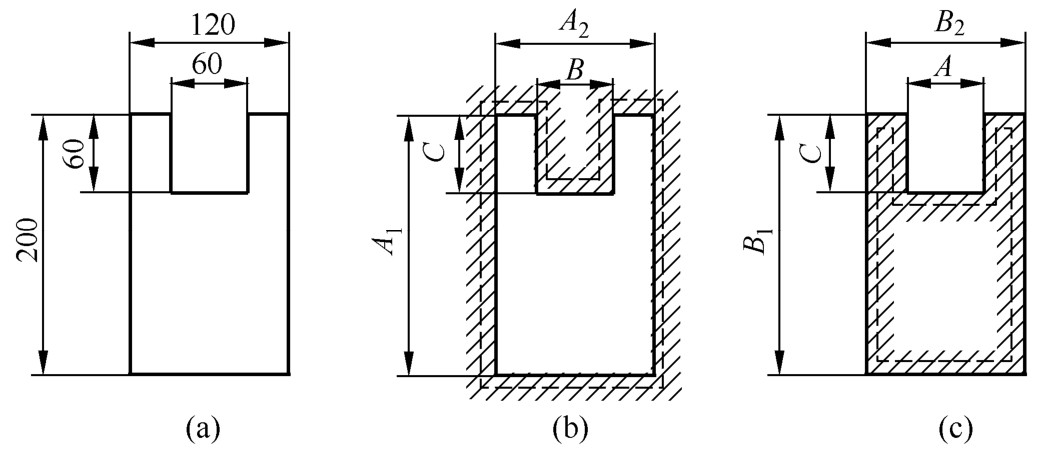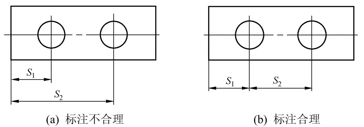 尺寸标注应符合冲压工艺的要求。如图2.7(a)的标注形式不合理,因为这样标注,尺寸 S 1 、 S 2 必须考虑到模具的磨损而相应给以较宽的公差,结果造成孔心距的不稳定;图2.7(b)所示标注形式,孔心距不受模具磨损的影响,比较合理。所以孔位置尺寸基准应尽量选择在冲裁过程中始终不参加变形的面或线上,切不要与参加变形的部分联系起来。