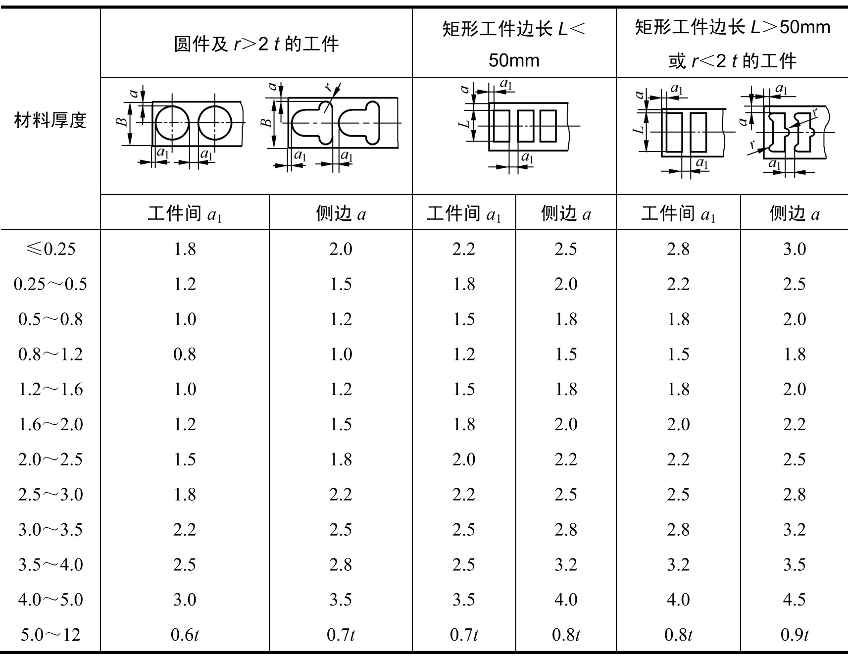 注: t 为材料厚度,当 t <1mm时,均以 t =1mm计。