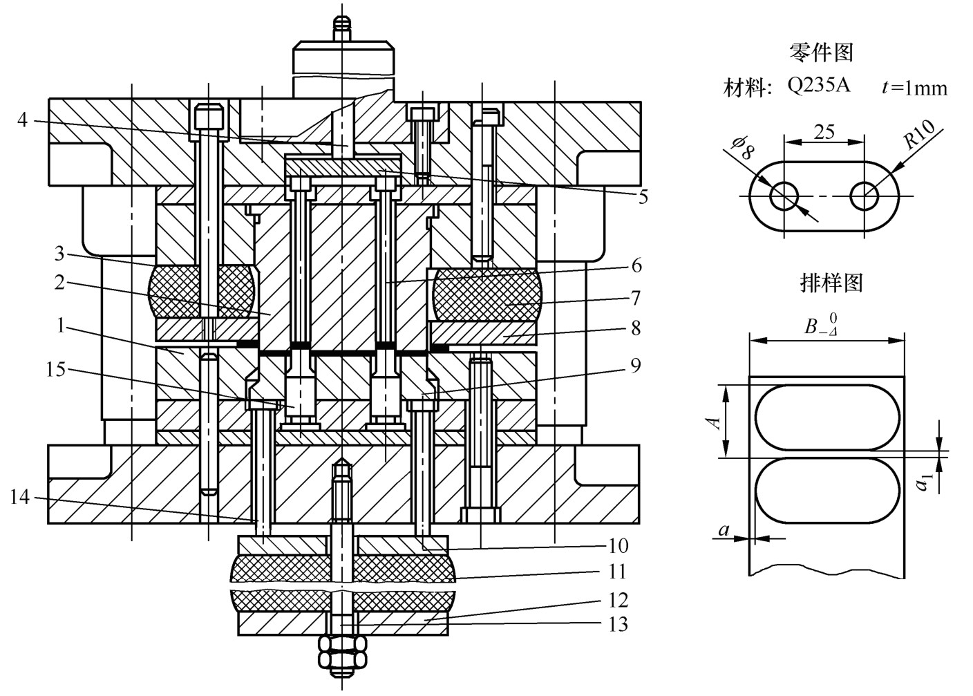 1—落料凹模;2—凸凹模;3,7,8—弹性卸料装置;4—打料杆;5—推板;6—推杆;9,10,11,12,13,14—弹顶装置;15—冲孔凸模