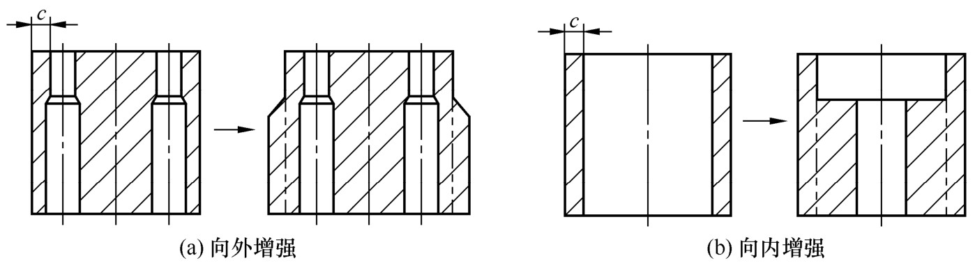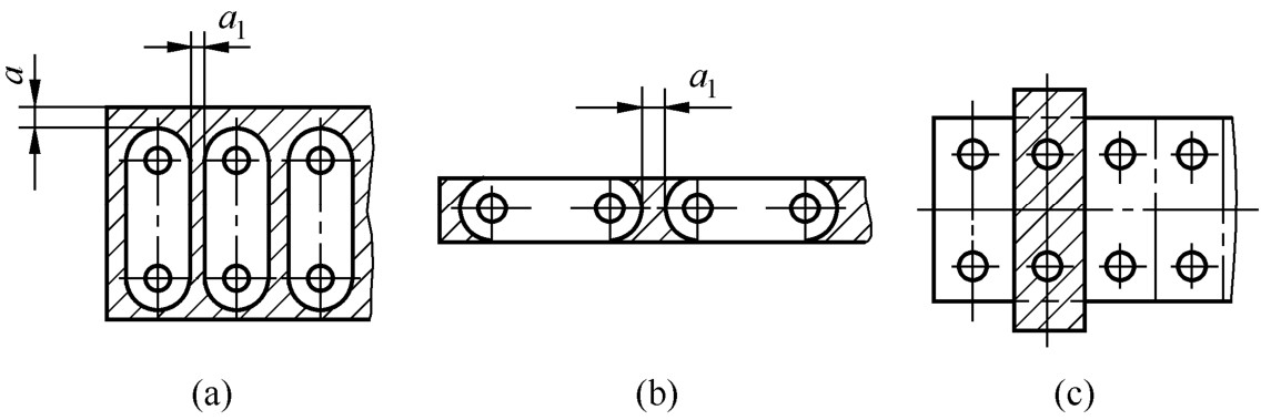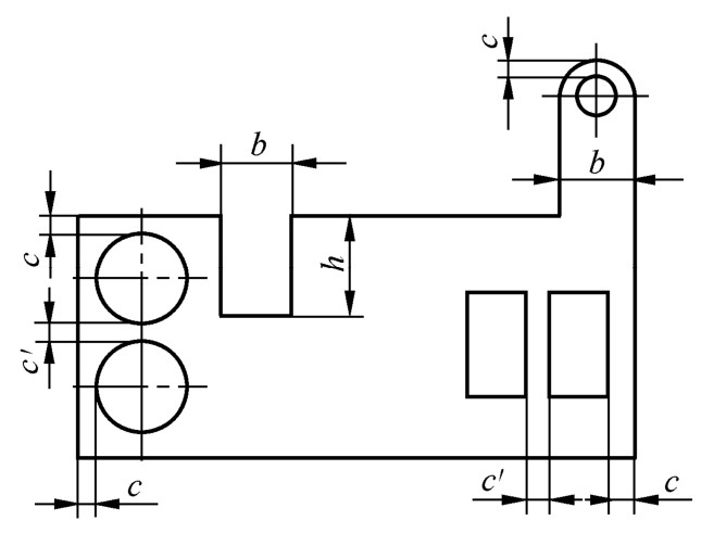 (3)要保证冲裁件的强度、凸模和凹模的强度。冲裁件尽量避免狭长的槽与过长的悬壁。图2.6所示的凸起和凹槽的宽度应保证 b >2 t 。若 b 值太小,则相应的凸模很薄,强度不足,甚至无法生产。应保证孔与孔之间的距离 c ′≥1.5 t ,孔与边缘之间的距离 c ≥ t ,否则会严重降低凹模的强度。