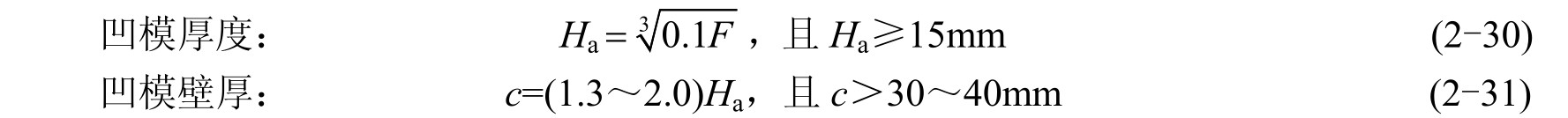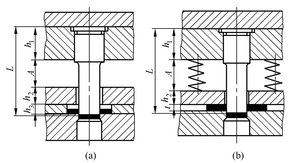 由式(2-28)可知,采用刚性卸料时凸模的长度为 L = h 1 + h 2 + h 3 + A 。其中,导料板厚 h 1 =8mm,卸料板厚 h 2 =12mm,凸模固定板厚 h 3 =18mm, A 由3部分组成:闭合状态时固定板和卸料板之间的距离、凸模的修磨量、凸模进入凹模的距离,一般在15~20mm之间取值,此处取 A =18mm,则