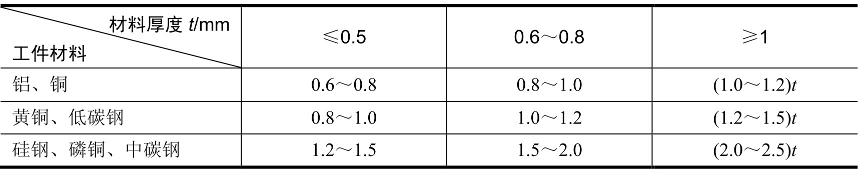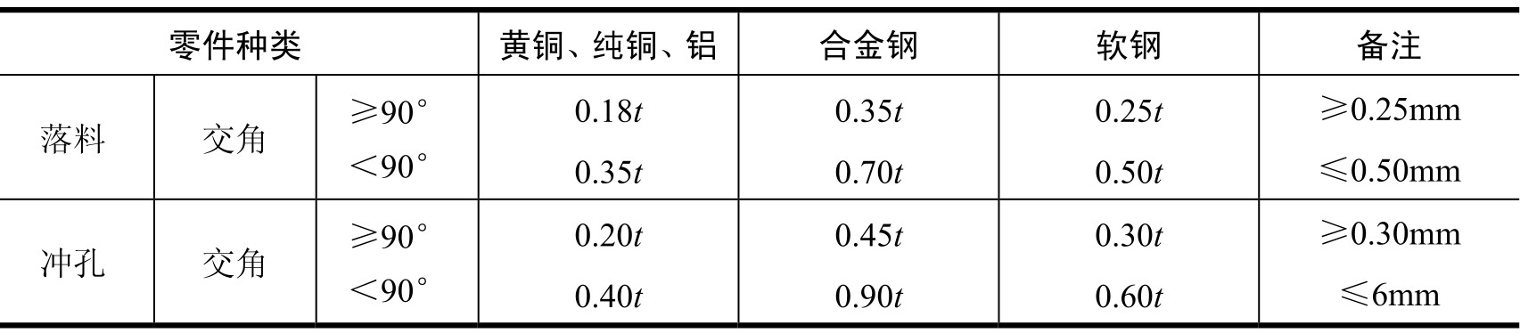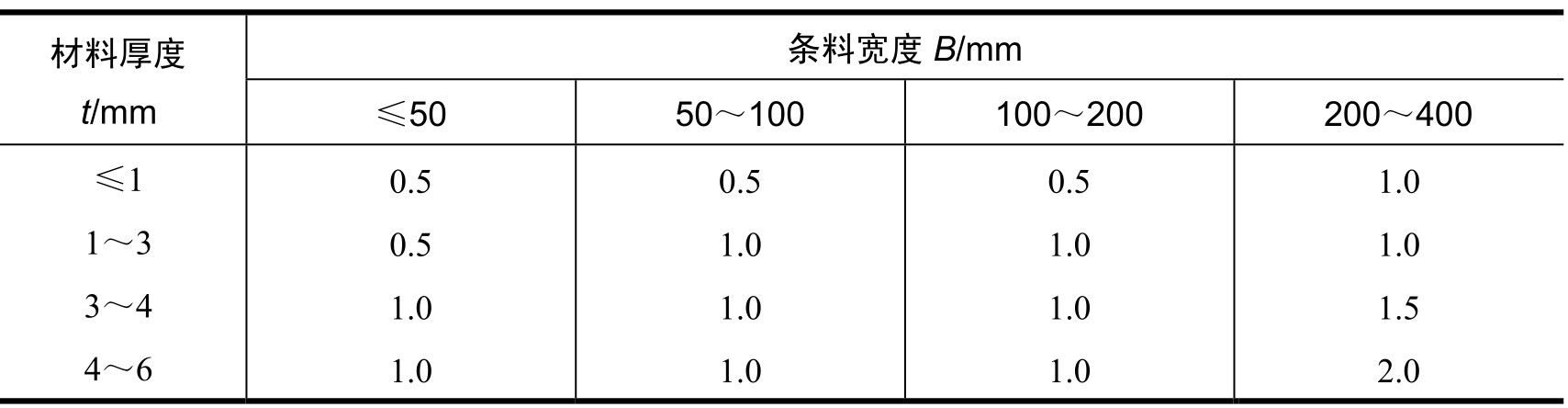 表2-1 冲裁件的最小过渡圆角半径 r min
