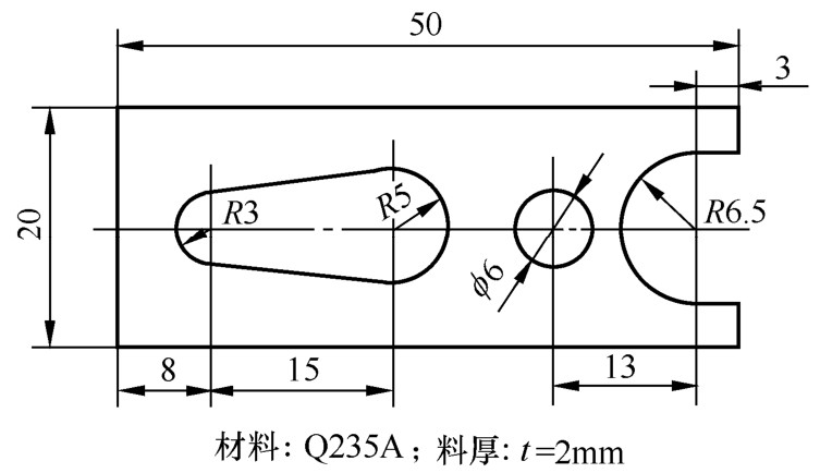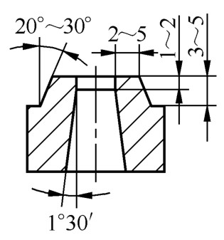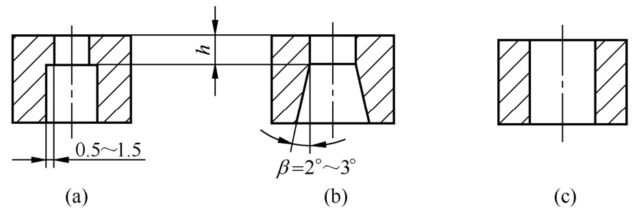 (2)外形和内孔应避免尖角,用圆弧过渡。这样可便于模具加工,减少热处理变形或冲压时的模具工作零件的开裂,减少冲裁时尖角处的崩刃和过快磨损。过渡圆弧的最小圆角半径 r min 见表2-1。