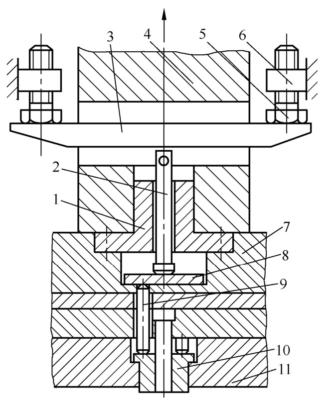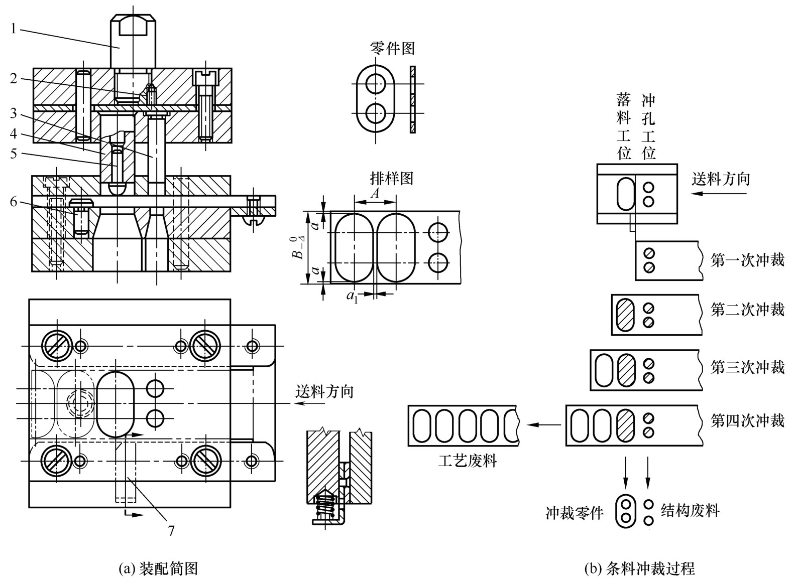 1—模柄;2—止转销;3—小凸模;4—大凸模;5—导正销;6—挡料销;7—始用挡料销