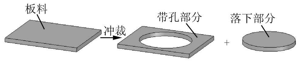 现象:应力作用下,裂纹不断扩展,当上、下裂纹汇合时,板料发生分离;凸模继续下压,将已分离的材料从板料中推出,完成冲裁过程。