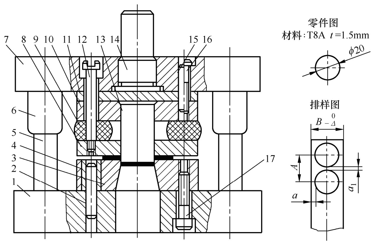 1—下模座;2,15—销;3—凹模;4—销套;5—导柱;6—导套;7—上模座;8—卸料板;9—橡胶;10—凸模固定板;11—垫板;12—卸料螺钉;13—凸模;14—模柄;16,17—螺钉