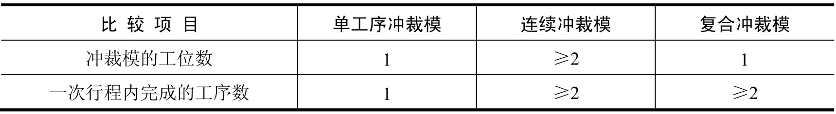 冲裁是冲压最基本、最常用的工艺方法之一,其模具的分类方法很多。按照不同的工序组合方式,冲裁模可分为单工序冲裁模、连续冲裁模和复合冲裁模,如表2-8所示。