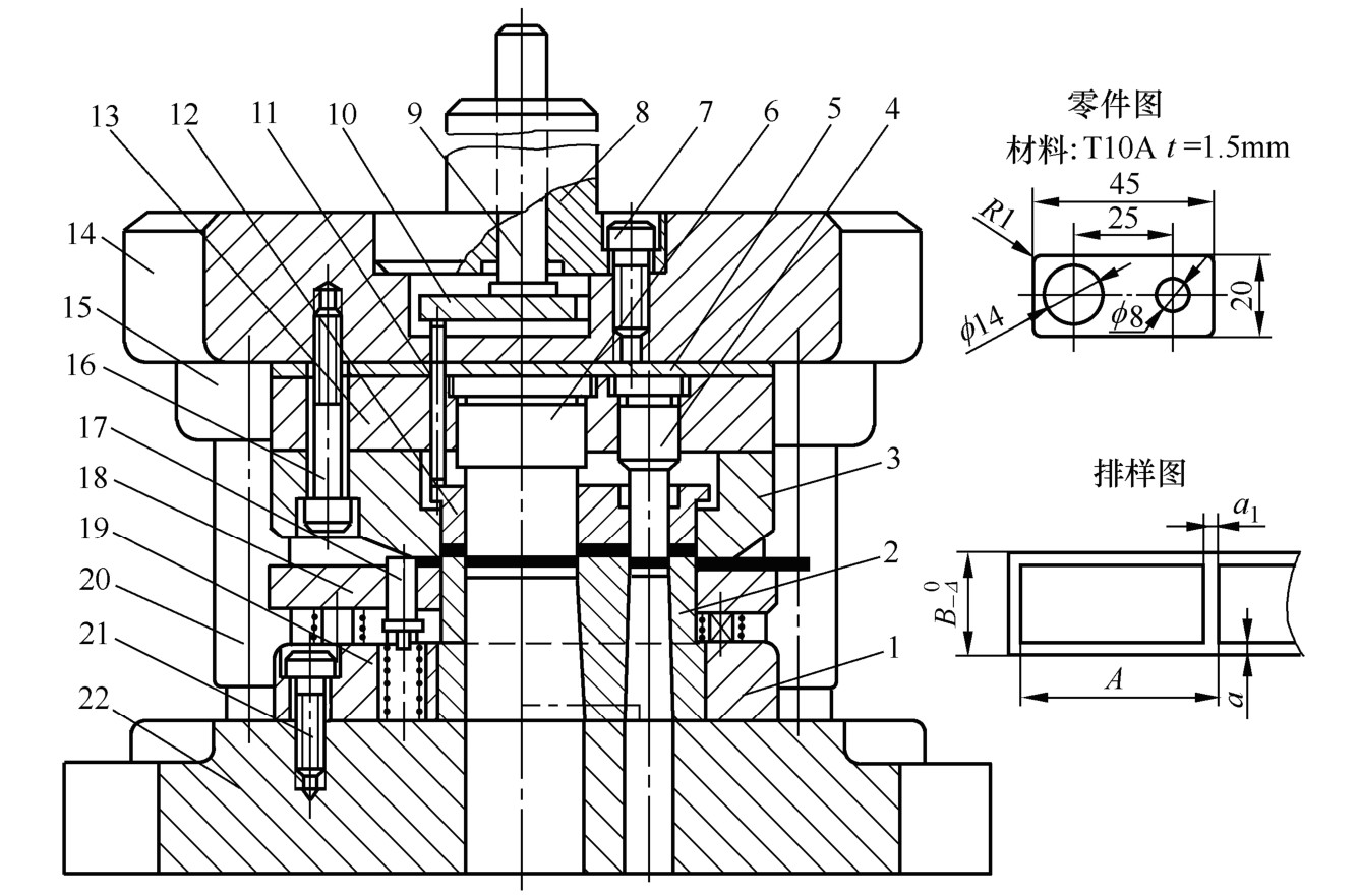 1—凸凹模固定板;2—凸凹模;3—凹模;4—凸模;5—垫板;6—凸模;7,16,21—螺钉;8—模柄;9—打料杆;10—推板;11—连接推杆;12—推件块;13—凸模固定板;14—上模座;15—导套;17—活动挡料销;18—卸料板;19—弹簧;20—导柱;22—下模座