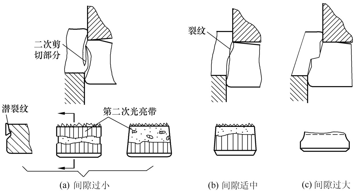 现象:凸模和凹模都切入板料,形成光亮的剪切断面。(发生塑性剪切变形,形成光亮带,但没有产生分离,没有裂纹,板料还是一个整体)