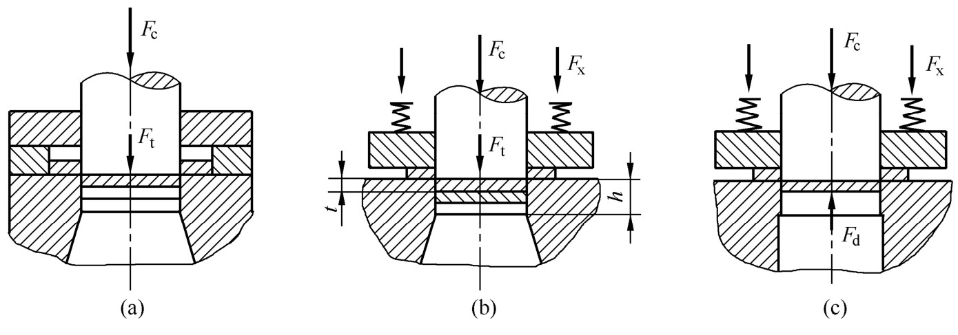 普通冲裁过程如图2.3所示,当冲裁间隙正常时,板料的冲裁变形过程可以分为以下3个阶段,即弹性变形阶段、塑性变形阶段、断裂阶段。