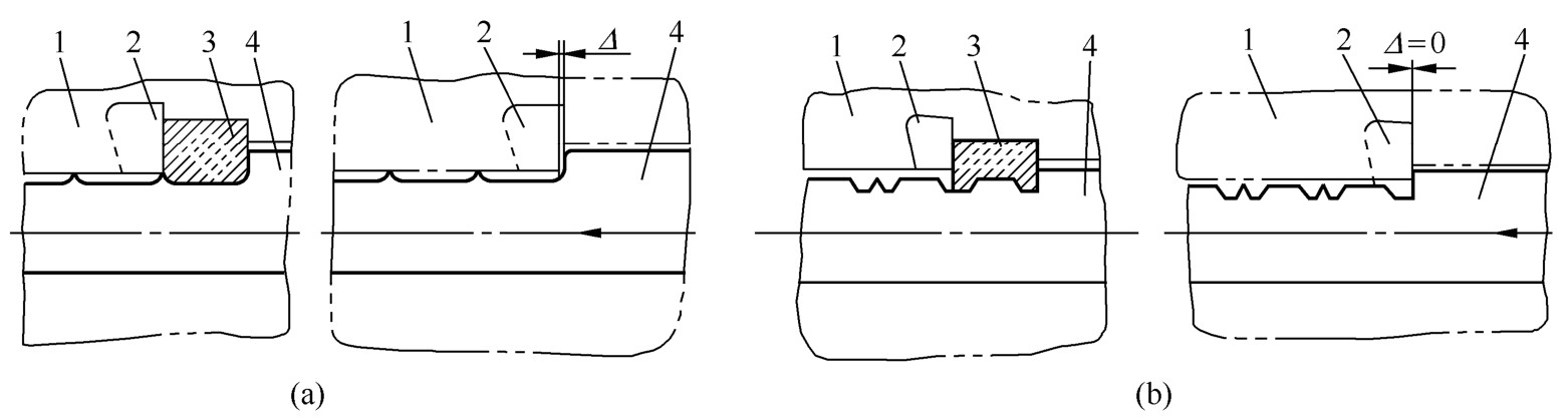 如图2.3(b)所示,凸模继续下压,板料的内应力达到屈服极限,板料在与凸、凹模刃口接触处产生塑性变形,此时凸模切入板料,板料挤入凹模,产生塑性剪切变形,形成光亮的剪切断面。随着塑性变形加大,变形区的材料硬化加剧,冲裁变形力不断增大,当刃口附近的材料由于拉应力的作用出现微裂纹时,标志着塑性变形阶段结束(此时 R eL ≤ P < τ b )。