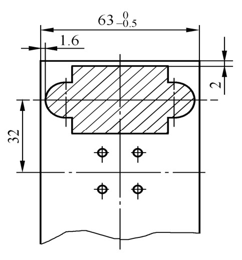 在这套模具中共有两个工位,在压力机的一个行程内完成两个工序:冲孔、落料。条料从右向左送进,在第一个工位上完成两个小孔的冲裁,条料继续送进,在第二个工位完成整个制件的冲裁工作,同时在第一个工位上又完成了两个小孔的冲裁,以此类推连续冲裁。