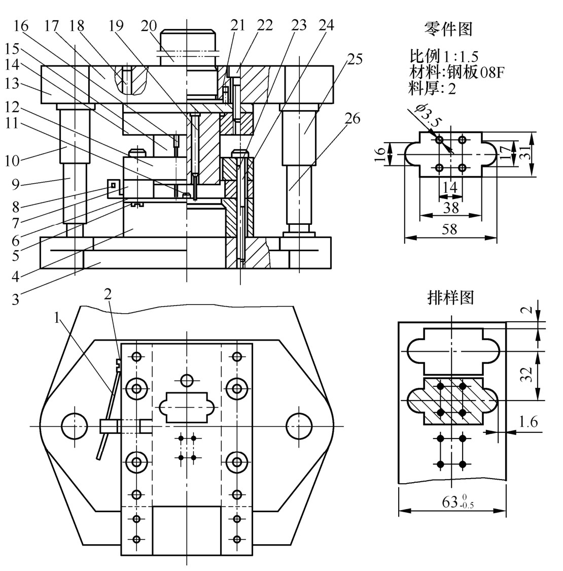 1—簧片;2—螺钉;3—下模座;4—凹模;5—螺钉;6—承料板;7—导料板;8—始用挡料销;9,26—导柱;10,25—导套;11—挡料钉;12—卸料板;13—上模座;14—凸模固定板;15—落料凸模;16—冲孔凸模;17—垫板;18—圆柱销;19—导正销;20—模柄;21—止转销;22—内六角螺钉;23—圆柱销;24—螺钉