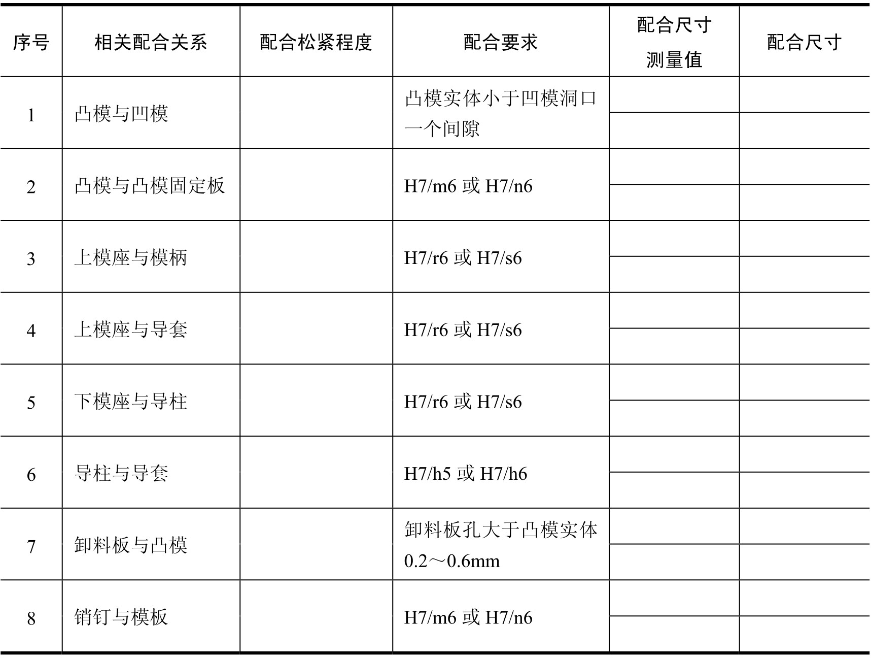 注:表中列出了模具配合零件间的配合要求,测绘者可根据测绘过程中的实感及实测数据填写有关栏目,为完成所测绘模具的装配图作准备。表中所留空行供记录所列的模具配合零件测绘数据用。
