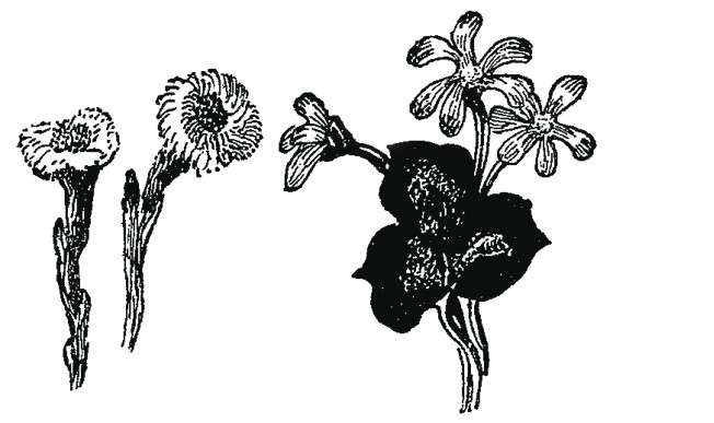 在沼泽地的边缘,还可以看到一种常绿灌木——蜂斗菜。它的叶子是暗绿色的,边缘卷起,底下发白。但是如果现在有谁站在这种灌木旁,是不会长时间仔细看叶子的,因为他会发现更有趣的东西:漂亮的粉红色小铃铛,跟越橘花很像。在这么早的时节能在森林里找到花,真令人惊喜。你采一把带回家,谁也不会相信这花是从野外,而不是从温室里采来的。